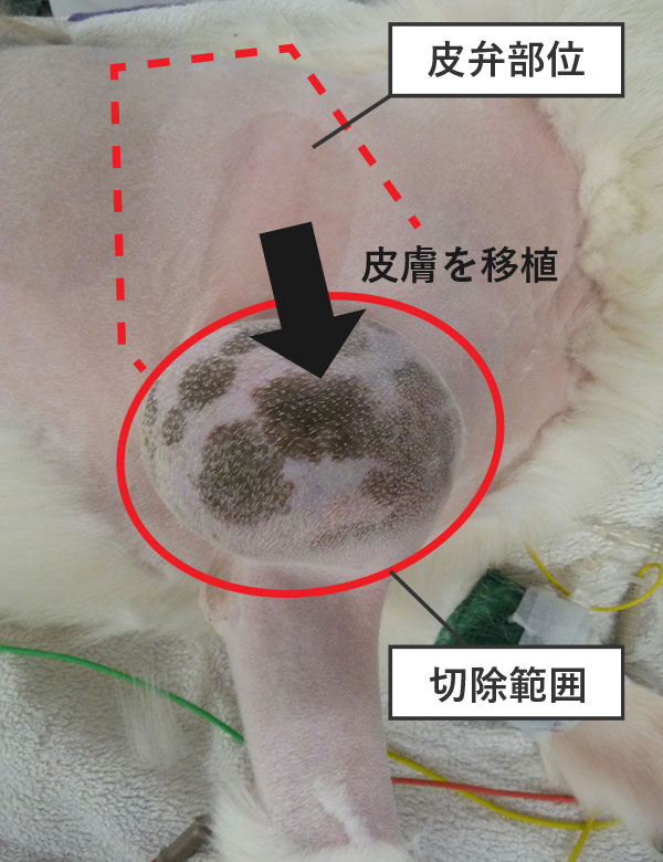 手術後、皮膚移植した部位はごく一部で回復が遅れたものの問題なく傷は回復しました。手術後の病理組織検査では、取り残しもない完全切除であったため、当初の目的である完全切除と機能温存が達成されました。ワンちゃんによっては、移植部位の毛の色や走行が周囲と異なるため、手術部位が目立つこともあります。