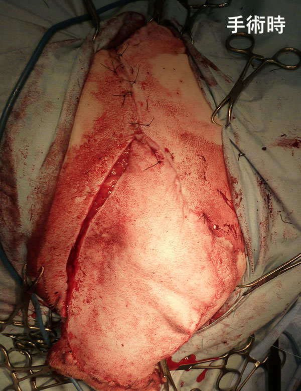 犬の皮膚の下に発生する腫瘍は、痛みもなく無症状であり、毛が生えていて分かりづらいことなどが理由で、かなり大きくなってきてから腫瘤の存在に飼主さまが気づくケースは決して少なくありません。このような腫瘍が四肢に発生した場合には、縫合するための十分な皮膚の余裕がないことや、周囲の筋肉と隣接しているため不完全な切除しかできず、場合によっては断脚が選択されることもあります。当院では、四肢に発生した軟部組織肉腫が疑わしい場合には、例外はありますが、できるだけ機能温存を優先し、そのうえで完全切除を目指しています。そのためには、CT検査による綿密な手術計画と精度の高い組織診断をあらかじめ実施し、場合によって皮膚移植術を利用することで、機能温存かつ完全切除の手術を実施できるようにしています。