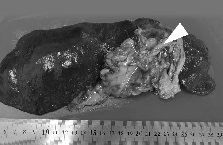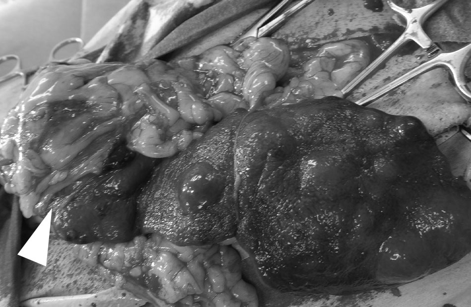2日間、ショックに対する治療をして状態が改善した後に、手術を実施しました。手術前のCT検査で、脾臓以外に問題がないことを確認したうえで、手術を行いました。開腹すると、すでに出血は止まっていましたが、脾臓に4.7cmの腫瘤とそれよりも小さな結節(しこり)を複数認めました。出血していた部位には大網(網状の臓器)が付着していました(図の白矢印が破裂していた腫瘤と大網)。脾臓を周囲の血管から切断し、全摘出を行いました。摘出した脾臓の病理組織診断は「血管肉腫」であり、手術時に出血を認めたことからステージ2と診断しました。