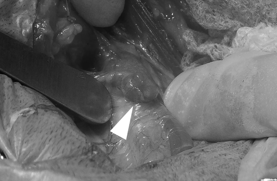 上皮小体は左右の甲状腺に2つずつあります。手術時に左甲状腺の1つの上皮小体だけが大きくなっていることを目視で確認し、それを摘出しました(図の白矢印が大きくなった上皮小体)。病理組織検査の結果は「上皮小体腺腫」でした。手術後、ただちにカルシウム値が基準範囲まで低下しましたが、手術後59時間からは基準値以下になりました(低カルシウム血症)。そのため、手術後2か月ほどは、カルシウム値を上昇させるために活性型ビタミンD3製剤のアルファカルシドールというお薬を使用し、カルシウム値を管理しました。その後は、お薬が無くてもカルシウム値は基準範囲内に安定するようになりました。また、手術後は、手術前に認められた膵炎の症状は消失し、腎機能の指標となるクレアチニン値も基準値まで回復しました。