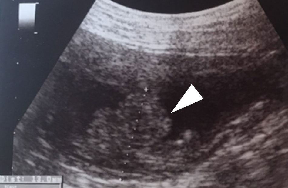 膀胱の一部(尖部)に約1.3cmの腫瘤を認めました(図の白矢印)。