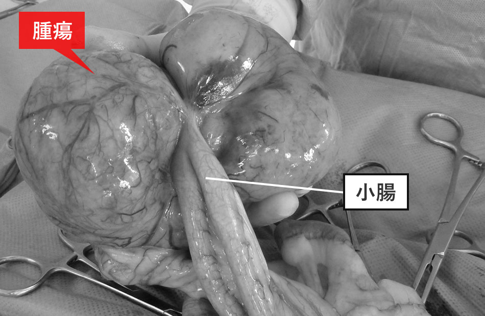 腹部の巨大腫瘤は小腸の一部に連続していることを確認しました。また、この巨大腫瘤によって腸間膜動脈を中心とした捻転を生じ(小腸軸捻転症)、一部の腸への血液供給が十分でないことが分かりました。他の臓器に転移を疑う所見は認めませんでした。